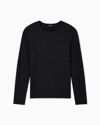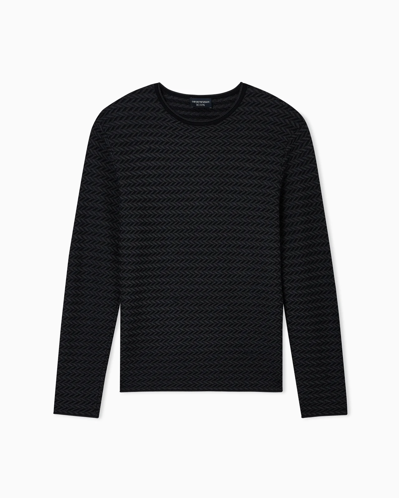 Crew-neck jumper made of pure virgin wool, embellished with an iconic two-tone chevron motif created by a weave with an offset stitch that creates an exclusive all-over raised pattern. The garment is part of the Icon capsule collection. Fineness: 14 Offset stitch Chevron motif Crew neck Eagle embroidery on the left hem Product Code: EM004452AF23023FC006
