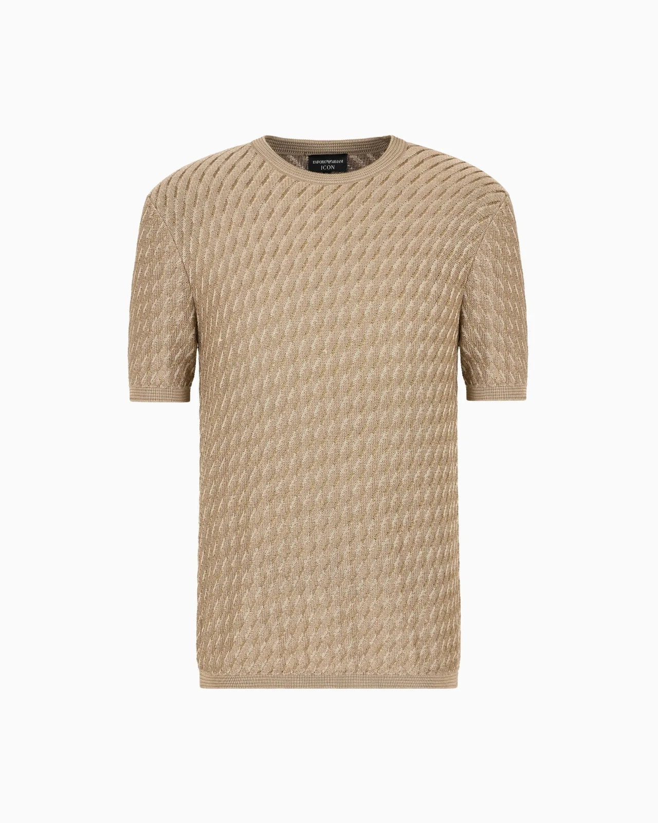 Short-sleeved crew-neck jumper in a viscose blend, featuring a two-tone op-art-effect jacquard motif all over. The Icon capsule collection dedicated to the Emporio Armani man makes a statement for the SS25 season with a selection that remains modern and up-to-date by reworking the brand’s iconic styles. Its exclusive 3D weave textures and typically Armani palette that ranges from cream, greige and hazelnut to the ubiquitous navy blue make the wardrobe instantly recognisable. Fineness: 13 Jacquard knit All-over pattern Crew neck Short sleeves Finished edges Product Code: EM001955AF15545F6004
