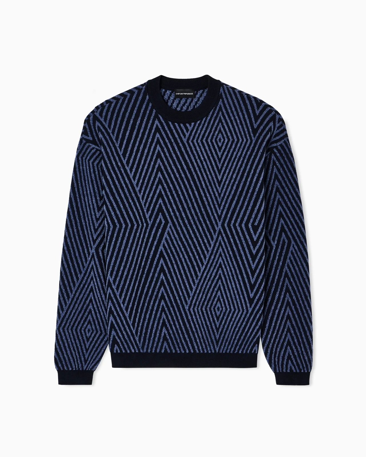 Crew-neck jumper made of a virgin-wool blend, featuring a refined jacquard with an op-art motif that creates a succession of intersecting oversized diamonds. Fineness: 12 Knit Jacquard Crew neck Long sleeves Finished edges Product Code: EM002636AF18119FB079