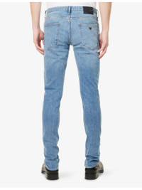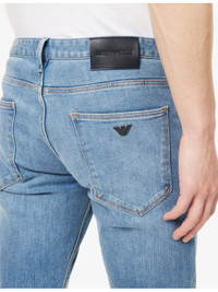 PRODUCT DETAILS - Emporio Armani stretch-denim jeans - 98% cotton, 2% elastane - Exposed button and concealed zip-fly fastening at front - Slim fit, low-rise, straight leg, belt loops, five pockets, brand plaque at front and back, brand patch at back, faded wash and whiskering - Machine wash at 30°C - Made in Tunisia - Size UK 32: rise 10in / 26cm, inside leg 33in / 85cm, leg opening 12in / 31cm - Model is 6ft 2in/1.88m and wears a size UK 32 - Lightweight, stretchy Ref: R04569225
