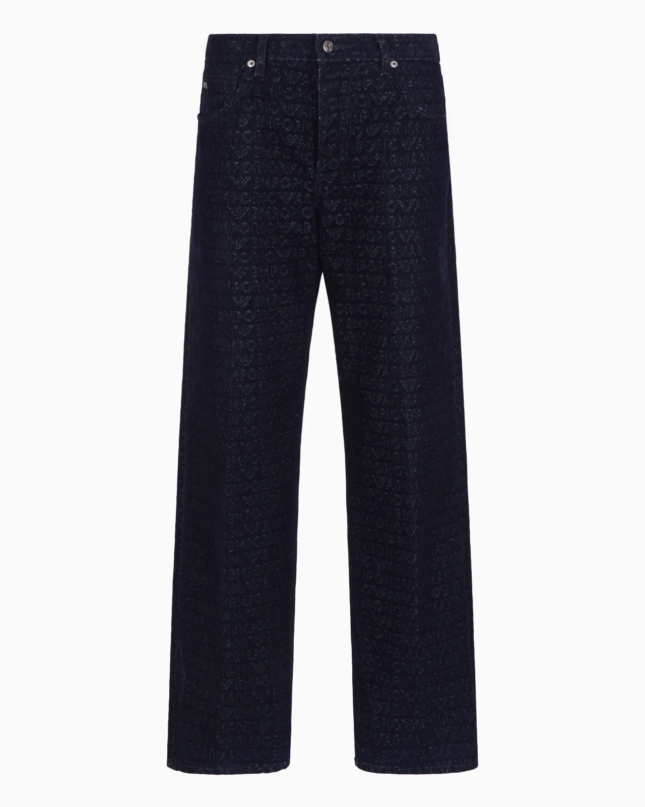 These jeans are made from pure cotton denim and defined by a medium-width leg, regular waist, low crotch and button fly. Loose fit. Made with a denim base and embellished with a very dense pattern featuring all-over logo lettering in a flocked print, a technique that provides a unique, velvety, embossed feel. Whether boldly displayed or merely hinted at, the logo is ever more a central feature on the Emporio Armani wardrobe everyday wear pieces. Loose fit Denim All-over flocked logo lettering Five-pocket style Regular waist with loops Button closure Coin pocket with logo plate Leather logo tag Eagle logo plate Product Code: EM000665AF13446UB118