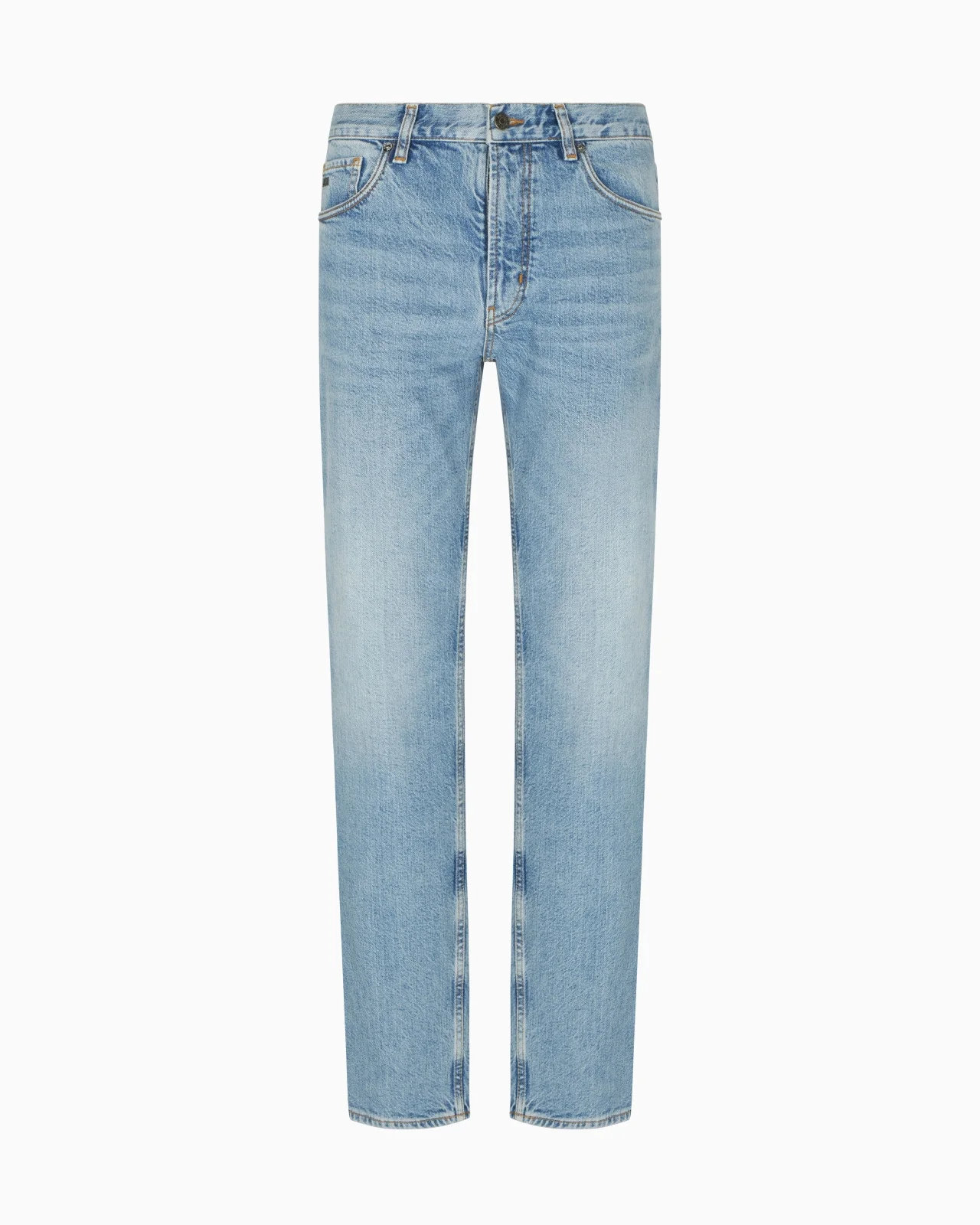 Five-pocket jeans featuring a regular waist, straight leg, comfortable rise and zip closure. The particularly stretchy fabric is treated with an enzyme stone wash that creates a subtle worn look on the canvas, with characteristic worn-look refined front ribs. Straight fit. Straight fit Five-pocket style Regular waist with loops Zip closure Coin pocket with logo plate Leather logo tag Eagle logo plate Product Code: EM000763AF14296MB003