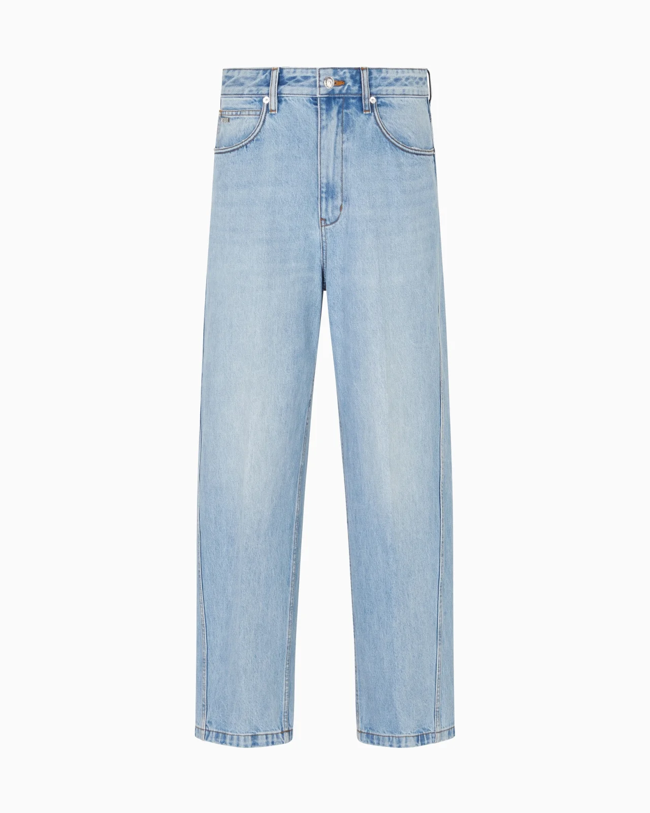 Jeans made from pure cotton denim, a fabric with a particularly rigid weave treated with an enzyme stone wash that creates a distinctive worn look on the canvas, with characteristic refined front whiskering. Designed with a regular waist, slightly oval twisted leg and a dropped crotch. A modern design that affirms the youthful spirit of the wearer. Twist fit. Twist fit Denim Five-pocket style Regular waist with loops Zip closure Coin pocket with logo plate Leather logo tag Eagle logo plate Tobacco-coloured stitching Product Code: EM001705AF17805MB003
