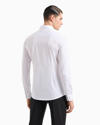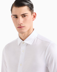Classic collar shirt in Lyocell-blend jersey. This shirt is made from Lyocell, which is a semi-synthetic fibre that has an exceptionally low impact on the environment. It is derived from the eucalyptus tree and is renowned for being very durable, breathable, absorbent and wrinkle-proof. This item belongs to the Essentials clothing selection, the Emporio Armani capsule collection that is an evergreen statement of style: an ongoing collection with clean, well-designed shapes for a wardrobe that meets the demands of any season. These “essential”, versatile pieces are a must-have for the male wardrobe. Product Code: 8N1CG11JUVZ10100 Details Composition 70% Lyocell 30% Cotton Jersey Classic collar Front buttoning Long sleeves Rounded cuffs with buttons Matching eagle on the left side of the hem Back yoke Fitting The model is 188 cm tall and is wearing size 40