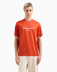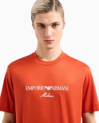 Crew-neck T-shirt featuring logo embroidery in the foreground. Made from a jersey in a blend of cotton and Lyocell, a semi-synthetic fibre that has an exceptionally low impact on the environment. It is derived from eucalyptus trees and is renowned for being moisture-wicking, durable, breathable and wrinkle-proof. Jersey Crew neck Short sleeves Logo embroidery Product Code: EM001033AF10017M5030