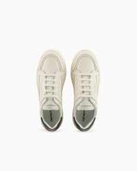 Palmellato calfskin sneakers with mesh tongue. The front of the tongue and back tab always have a screen-printed Emporio Armani logo. Clean-lines and comfort define these sneakers with their essential design that echoes 90s-style basketball footwear. Leather Palmellato finish Mesh tongue Visible logo Lace-ups Rounded toe Contrasting back tab Rubber soles Product Code: EM003702AF19573M0019