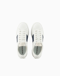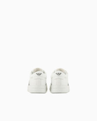 Calfskin sneakers with contrasting side logo detail. The front of the tongue and back tab have a screen-printed Emporio Armani logo and eagle motif. Clean-lines and comfort define these sneakers with their essential design that echoes 90s-style basketball footwear. Product Code: X4X570XN8401T849 Details Composition 100% Bovine leather Leather Visible logo Lace-ups Rounded toe Rubber soles