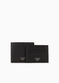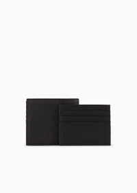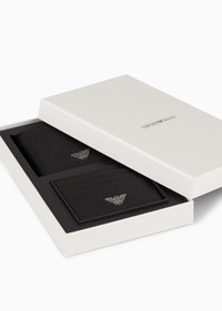 Refined gift idea: set consisting of a matching wallet and card holder in regenerated leather made from certified recycled material, complete with a logo gift box. Every product made from regenerated leather is the result of an eco-sustainable process that re-purposes left-over leather, processed and assembled without using any adhesive whatsoever and very conscious of water conservation. Not wasting resources helps to make this leather an environmentally-friendly material, yet it retains the same qualities of real leather, both to the eye and to the touch. A collection of accessories created to satisfy the requirements of the Emporio Armani man who demands stylish, work-ready looks. The essential, alluring design features a Saffiano-print finish and is customised with a shaped, perforated metal eagle logo. Product Code: Y4R237Y138E181072 Details Composition 100% Polyurethane The material is made of 100% regenerated leather fibres Measurements: 10.5 x 9 x 1.5 cm Two-piece set Regenerated leather Saffiano leather Eagle plate Logo gift box included