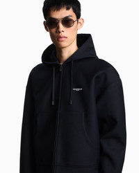 Sweatshirt with drawstring hood and zip fastening. The piece is distinctive courtesy of the formal light wool fabric from which it is made, a texture that lends itself to completing the most refined looks. The micro logo lettering on the chest with a rubberised finish makes the piece understated. Light wool Drawstring hood Zip closure Pouch pockets Rubberised logo Long sleeves Product Code: EM002879AF18314UB118