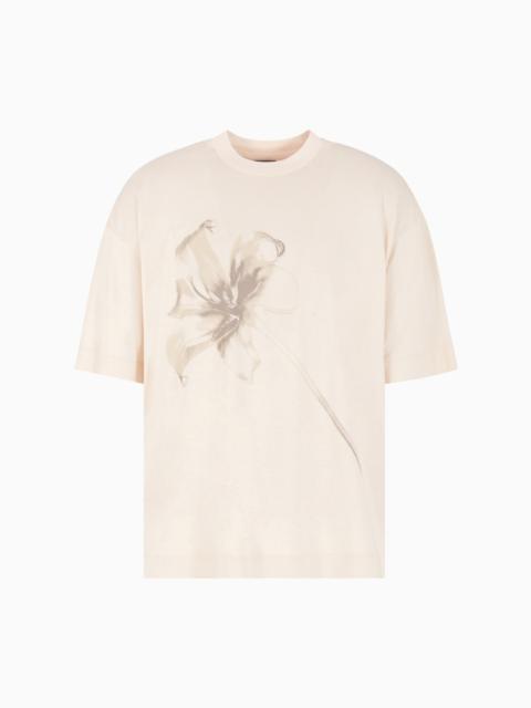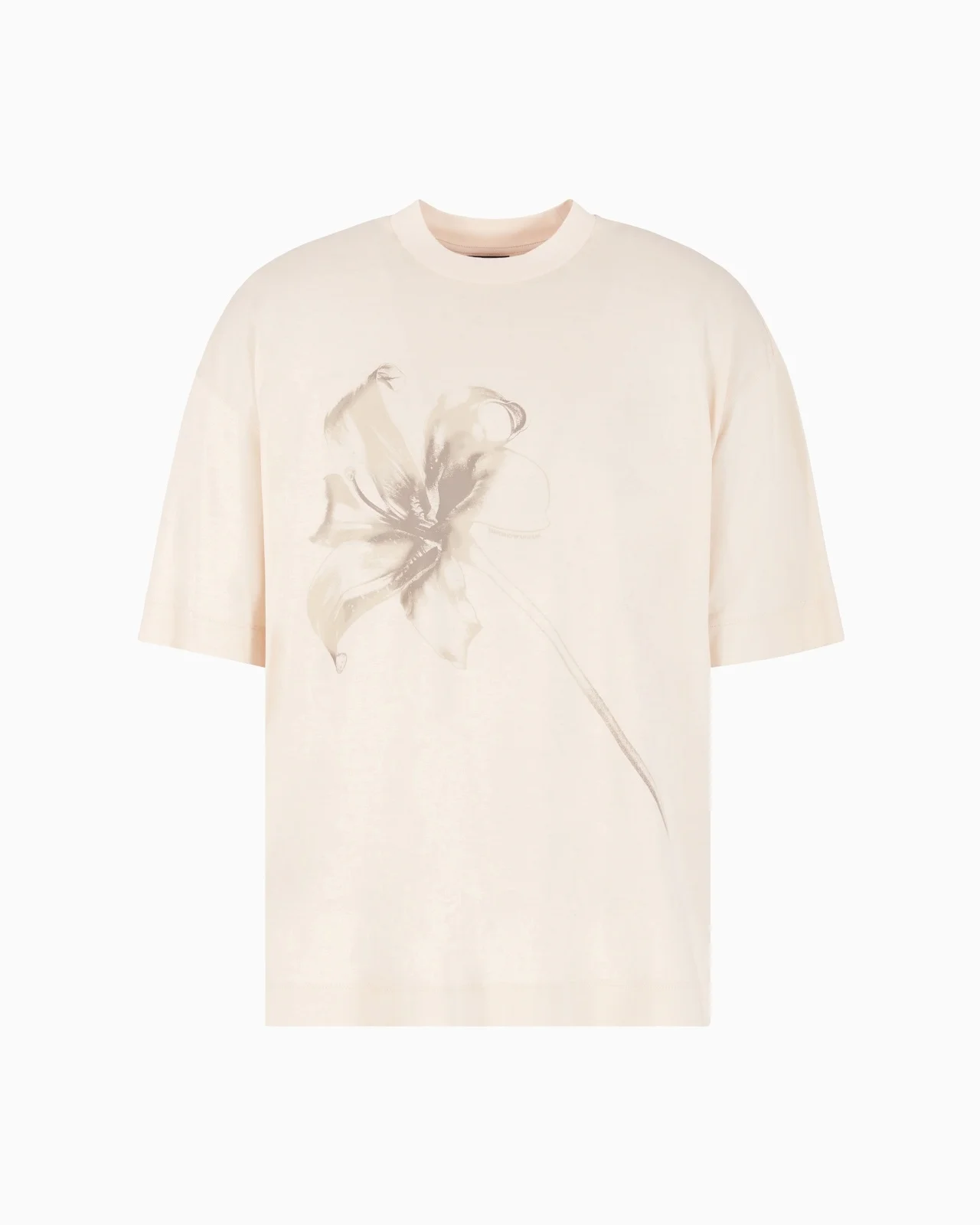 Oversized-fit, crew-neck T-shirt with front flower print. The graphic design and embroidery that embellish this part of the collection convey an immediate feeling of lightness, evoking delicate shapes and subtle figures, as if sculpted by the wind on sand dunes. Made from a jersey in a blend of cotton and Lyocell, a semi-synthetic fibre that has an exceptionally low impact on the environment. It is derived from eucalyptus trees and is renowned for being moisture-wicking, durable, breathable and wrinkle-proof. Oversized fit Jersey Crew neck Short sleeves Collection print Product Code: EM001460AF10017U1088