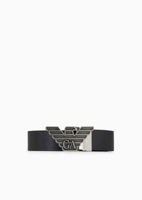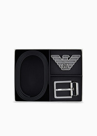A refined idea for gifting, this gift box contains a reversible calfskin belt featuring a smooth side and a Saffiano print on the other, along with a special interchangeable buckle—the iconic eagle one creates a statement look, while the simple metal one provides classic allure. Emporio Armani style is also found in small leather goods, thanks to functional accessories that complement the refined and on-trend design. Made in Italy. Product Code: Y4S270YLP4X188001 Details Composition 100% Bovine leather Measurements: 125 x 3.5 cm Three-piece set Leather belt Reversible Metal buckle Shaped buckle Logo gift box included Made in Italy