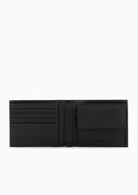 Leather bifold wallet with external pocket and debossed logo. A new line of accessories and small leather goods in tumbled leather, with clean, modern lines that affirm its sophisticated style. The ribbed construction typical of fine leather goods and the bags’ metal tab-snap closure make them perfect for daily professional life, for those who opt for functional accessories with classic yet playful appeal. Product Code: Y4R570YQ13X180648 Details Composition 100% Bovine leather Measurements:12 x 9.5 cm Leather Tumbled finish Debossed logo Outer pocket Banknote compartment Card pockets Coin purse with flap