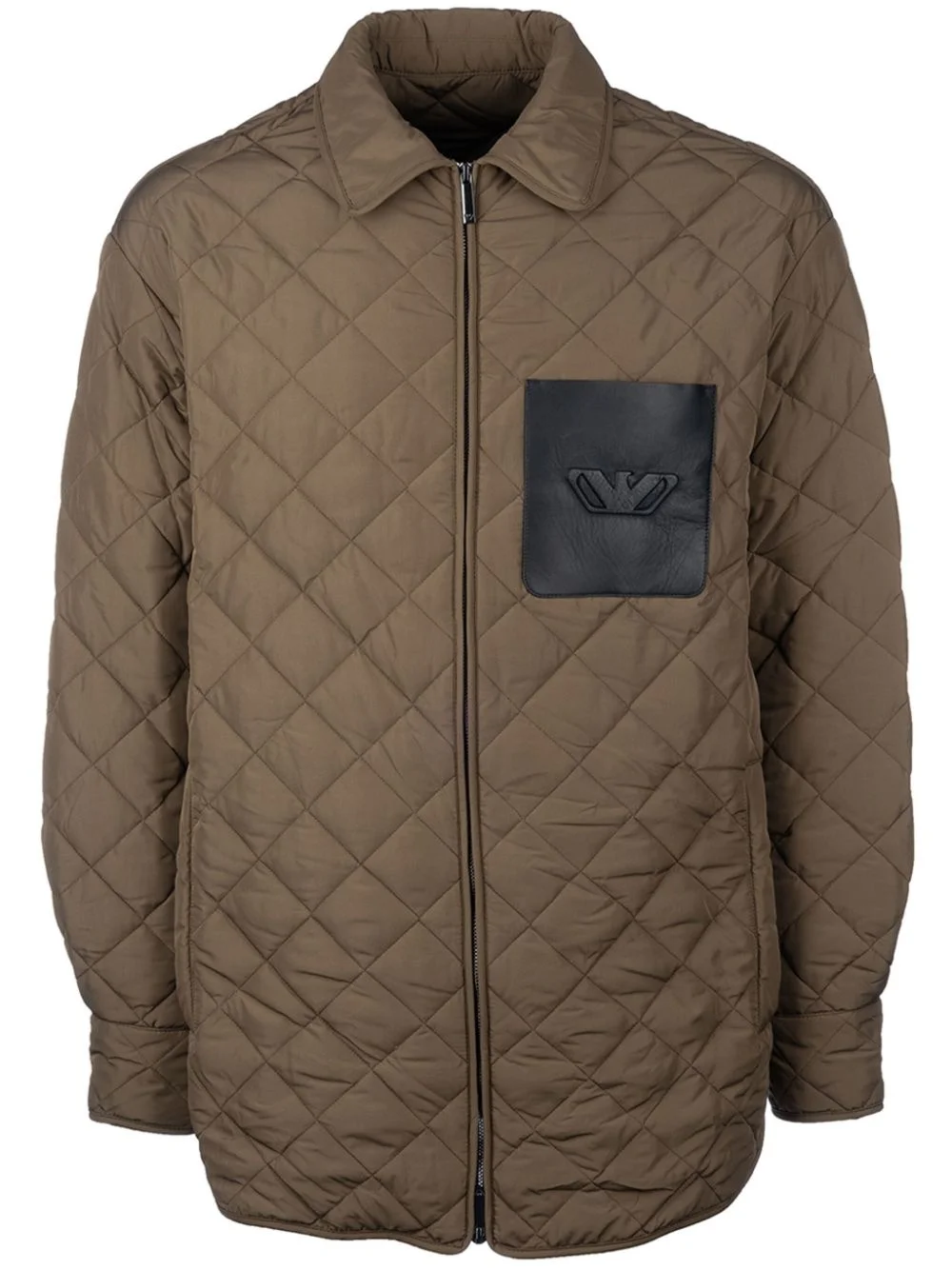 logo-embossed quilted jacket Highlights - Khaki - Quilted - Embossed logo to the front - Front two-way zip fastening - Classic collar - Chest patch pocket - Long sleeves - Two side welt pockets Imported Composition Polyester 100% SIZE & FIT FittingInformation Designed for a regular fit, allowing for a comfortably loose fit throughout the body Made from a quilted non-stretch fabric, giving it no natural elasticity