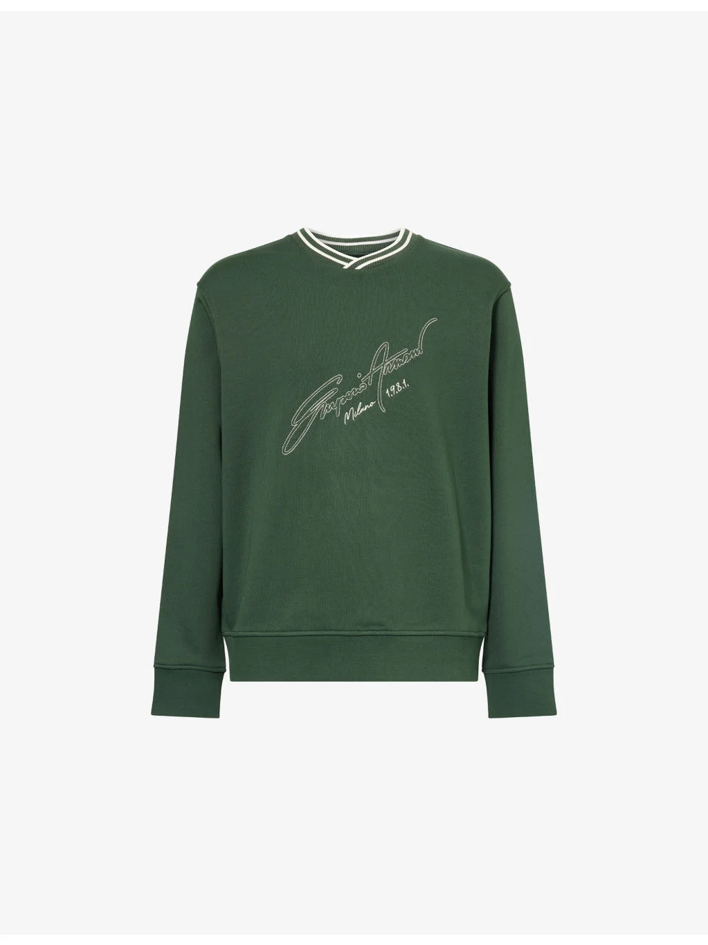 PRODUCT DETAILS - Emporio Armani cotton sweatshirt - 100% cotton - Relaxed fit, contrast-stripe crew neck, long sleeves, embroidered logo at front, ribbed trims - Model is 6ft 2in/1.88m and wears a size medium - Midweight, stretchy Ref: R04569253