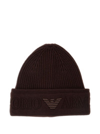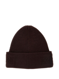 logo-embroidered ribbed beanie hat Highlights - Brown - Ribbed texture - Embroidered logo - Wool blend - Turn-up brim Imported Composition Polyester 100%, Virgin Wool 100% Washing instructions Read Manufacturer Guidelines