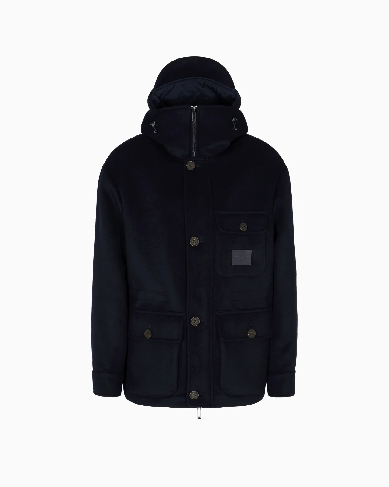 Blouson with hood and contoured visor, with a full-zip and front button fastening. The piece is made from virgin wool cloth with a small percentage of cashmere that makes it feel softer. A multi-pocket design, finished with a crinkled nylon inner lining and practical inner waist pulls that lends itself to everyday and city looks. Wool cloth Hood with visor Full-zip closure Front buttoning Patch pockets with flap and button Inner waist pulls Long sleeves Single-buttoned cuffs Nylon lining Two inside pockets with zipped compartments Product Code: EM003183AF18229UB118