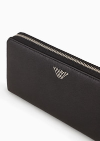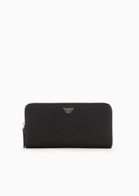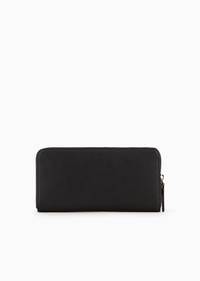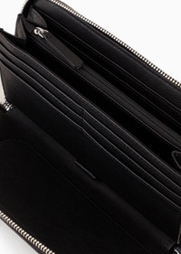 Zip-around wallet in regenerated leather made from certified recycled material. A practical and refined accessory with convenient internal compartments for organising your cards, documents and banknotes. Every product made from regenerated leather is the result of an eco-sustainable process that re-purposes left-over leather, processed and assembled without using any adhesive whatsoever and very conscious of water conservation. Not wasting resources helps to make this leather an environmentally friendly material, yet it retains the same qualities of real leather, both to the eye and to the touch. A collection of accessories created to satisfy the requirements of the Emporio Armani man who demands stylish, work-ready looks. The essential, alluring design features a Saffiano-print finish and is customised with a shaped, perforated metal eagle logo. Product Code: Y4R169Y138E181072 Details Composition 53% Polyamide 47% Polyester The material is made of 51% regenerated leather Measurements: 22 x 11 x 2.5 cm Saffiano leather Eagle plate Wrap-around zip closure Gusseted interior Banknote compartments Card pockets Zipped coin purse