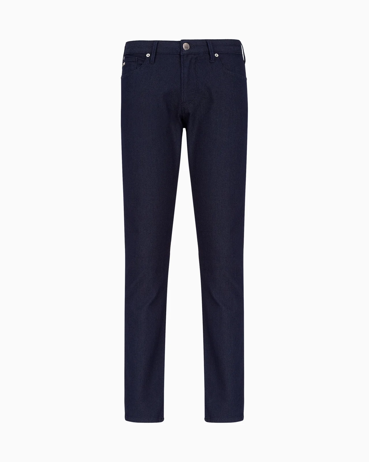 Trousers made from a cotton blend, featuring a micro-armure polka-dot texture. An item that combines the formal practicality of five-pocket trousers with the casual style of jeans. Armure fabric elevates a piece that completes even the most modern outfits. This item belongs to the Essentials clothing selection, the Emporio Armani capsule collection that is an evergreen statement of style: an ongoing collection with clean, well-designed shapes for a wardrobe that meets the demands of any season. These “essential”, versatile pieces are a must-have for the male wardrobe. Product Code: 8N1J061N2NZ10958 Details Composition 56% Cotton 44% Polyester Slim fit Polka-dot armure fabric Five-pocket style Low-rise waist with loops Zip and button closure Coin pocket with logo plate Logo label Eagle logo plate Fitting The model is 188 cm tall and is wearing size 32