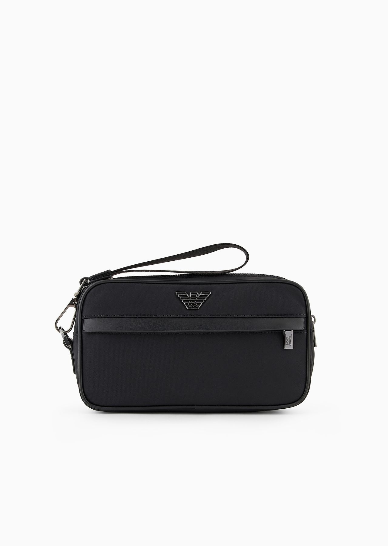 Recycled nylon washbag with zip closure, external zip compartment and practical clip-on wristlet. Defined by a modern, linear design and urban allure, this line features nylon items made from certified recycled material, with details in regenerated leather and shaped metal eagle logos. A family of accessories showcasing the brand’s eco-sustainable and environmentally friendly journey over the past several seasons. Product Code: Y4R581Y217J180001 Details Composition 100% Polyamide 0% Polyurethane The fabric is made of 50% recycled polyamide Measurements: 21 x 17 x 6.5 cm Eagle plate Leather details Zip closure Zipped outer pocket Wristlet with snap hook Back zipped pocket