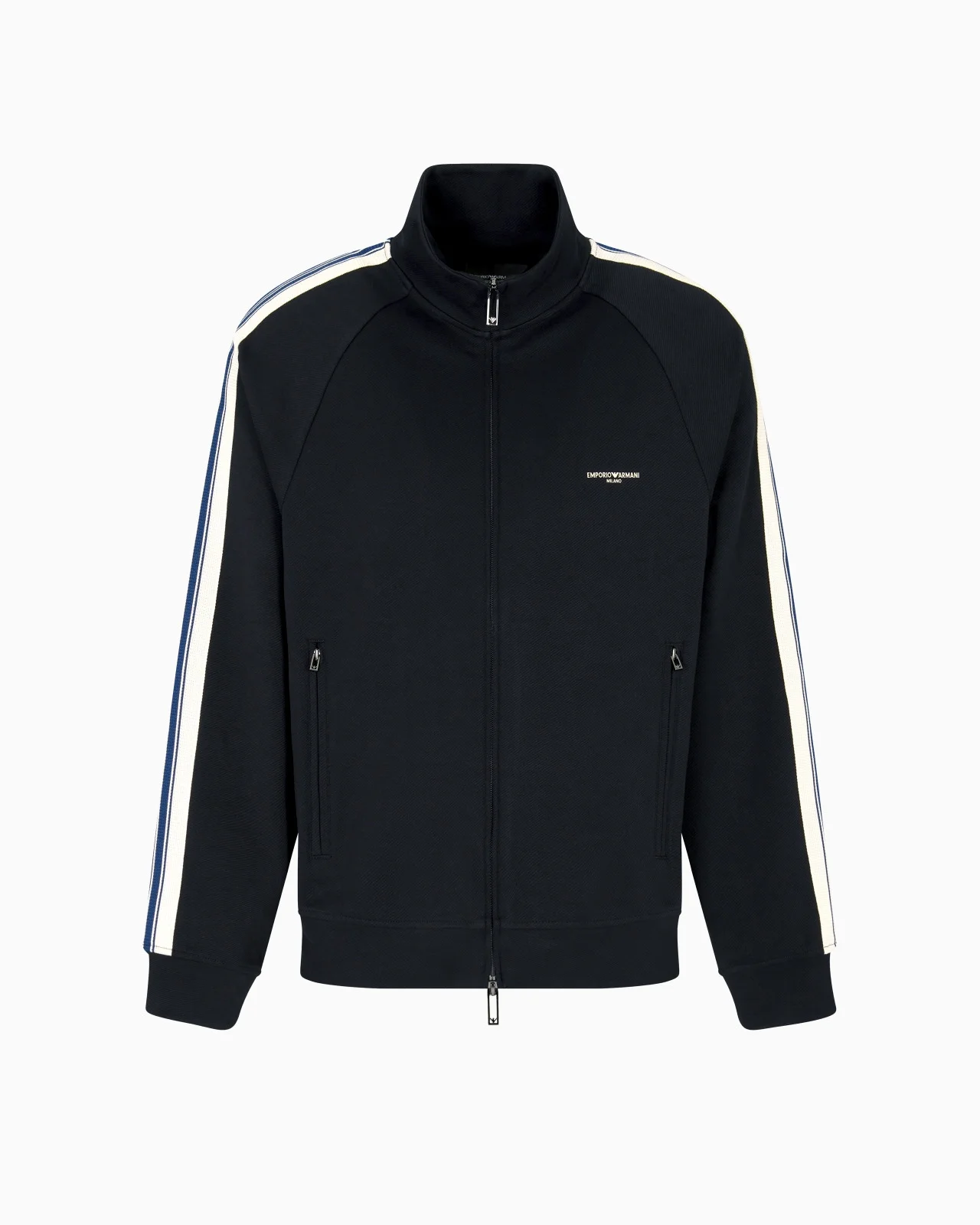 Sweatshirt with full zip, made of jersey in a cotton and modal blend. The garment is distinguished by contrasting bands applied on the sleeves, and the Emporio Armani Milano logo on the chest. Jersey Full zip Logo on the chest Long sleeves Contrasting bands Side pockets with zip Product Code: EM002872AF13488UB118