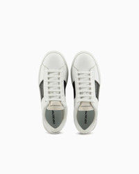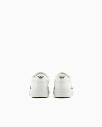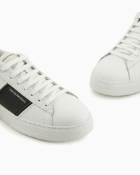 Calfskin sneakers with contrasting side logo detail. The front of the tongue and back tab have a screen-printed Emporio Armani logo and eagle motif. Clean-lines and comfort define these sneakers with their essential design that echoes 90s-style basketball footwear. Product Code: X4X570XN8401K488 Details Composition 100% Bovine leather Leather Visible logo Lace-ups Rounded toe Rubber soles
