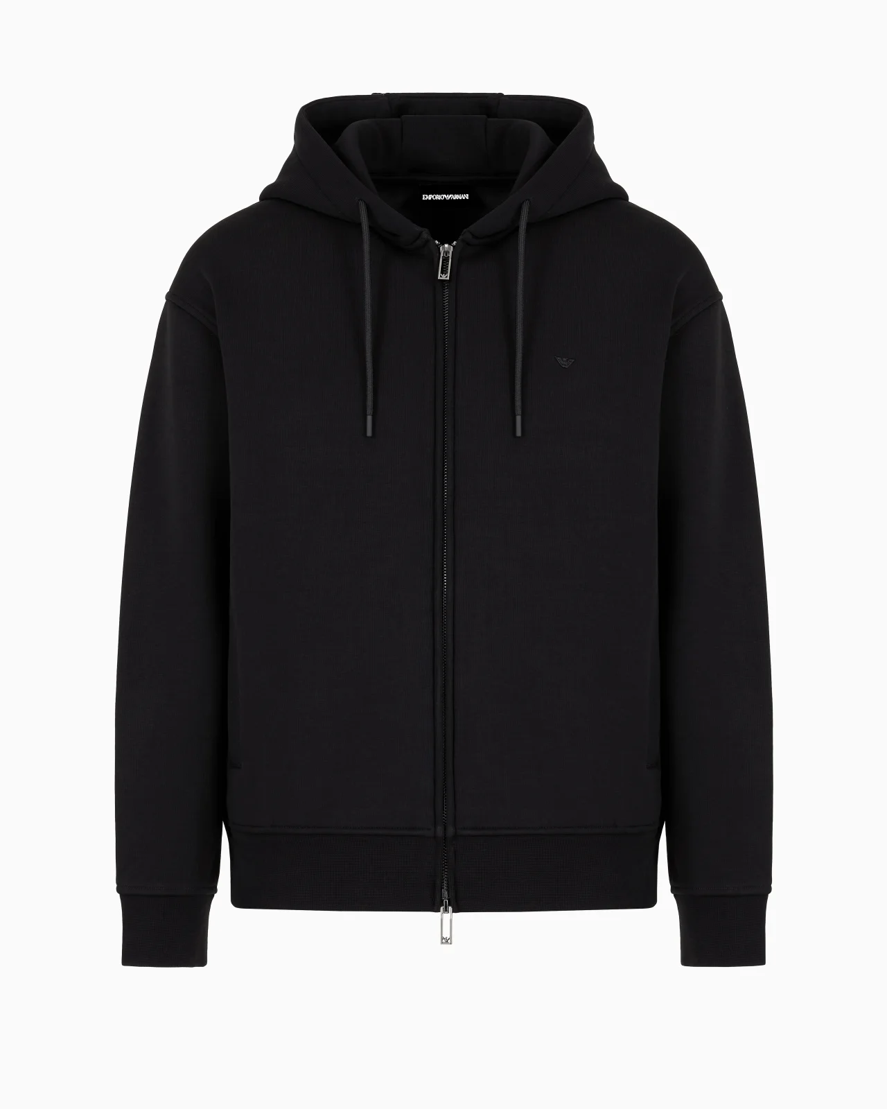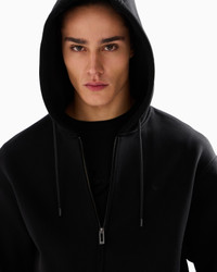 Sweatshirt with drawstring hood and front zip closure. Made of a Lyocell-blend jersey with a warm, cosy fleece interior. Product Code: 6D1M901JOTZ10999 Details Composition 45% Polyester 24% Cotton 24% Lyocell 7% Elastane Jersey Drawstring hood Zip closure Micro eagle embroidery Fleece lining Fitting The model is 188 cm tall and is wearing size 48/M (Italian Size)