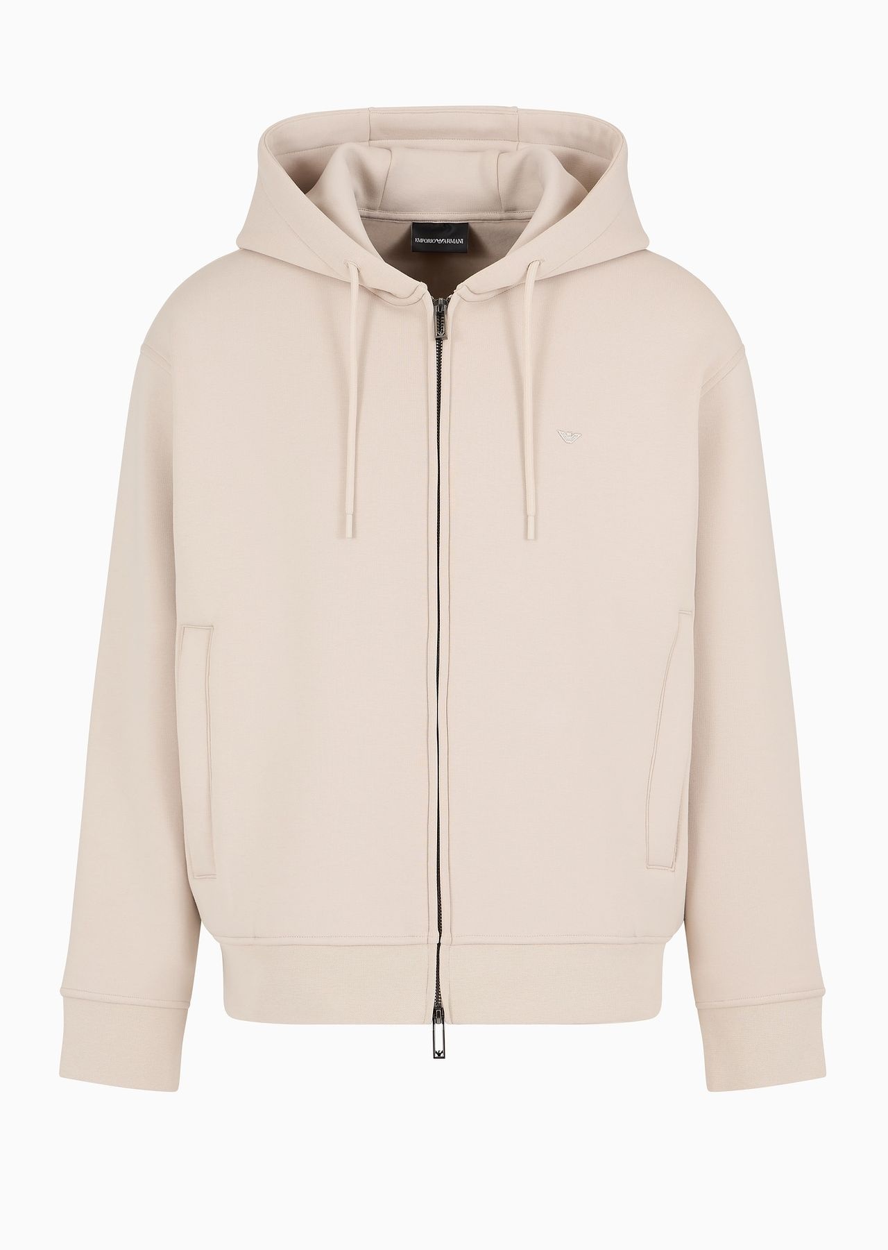 Sweatshirt with drawstring hood and front zip closure. Made of a Lyocell-blend jersey with a warm, cosy fleece interior. Product Code: 6D1M901JOTZ106G2 Details Composition 45% Polyester 24% Cotton 24% Lyocell 7% Elastane Jersey Drawstring hood Zip closure Micro eagle embroidery Fleece lining Fitting The model is 188 cm tall and is wearing size 48/M (Italian Size)
