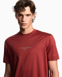 Cotton and Lyocell blend jersey crew-neck T-shirt. The Emporio Armani Milano logo accompanied by the iconic eagle is offered with an original three-dimensional effect: the matching dark part is created using an embossed technique that gives the subject an embossed domed look, while the contrasting white print creates a chiaroscuro shaded effect that enhances the 3D look. Regular fit Jersey Crew neck Short sleeves Domed logo Product Code: EM002838AF10761U5035
