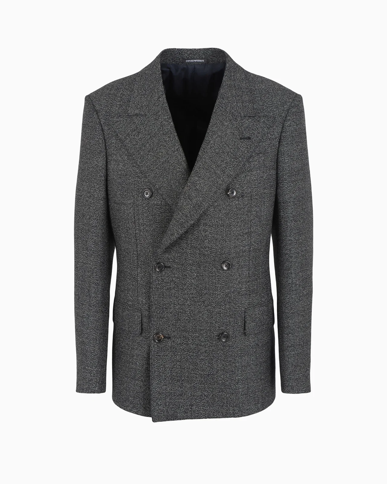Double-breasted jacket made of pure virgin wool grisaille, a brushed weave whose threads in different shades merge into a single colour, making the texture compact and particularly durable. The resulting fabric is characterised by a micro-textured weave that gives the entire garment a salt-and-pepper effect. Product Code: EM000290TE112221O8004 Details Composition 100% Virgin Wool Grisaille weave Double-breasted Buttoned fastening Long sleeves Button cuffs Side welt pockets with flap Lined garment Fitting The model is 188 cm tall and is wearing size 48/M (Italian Size)