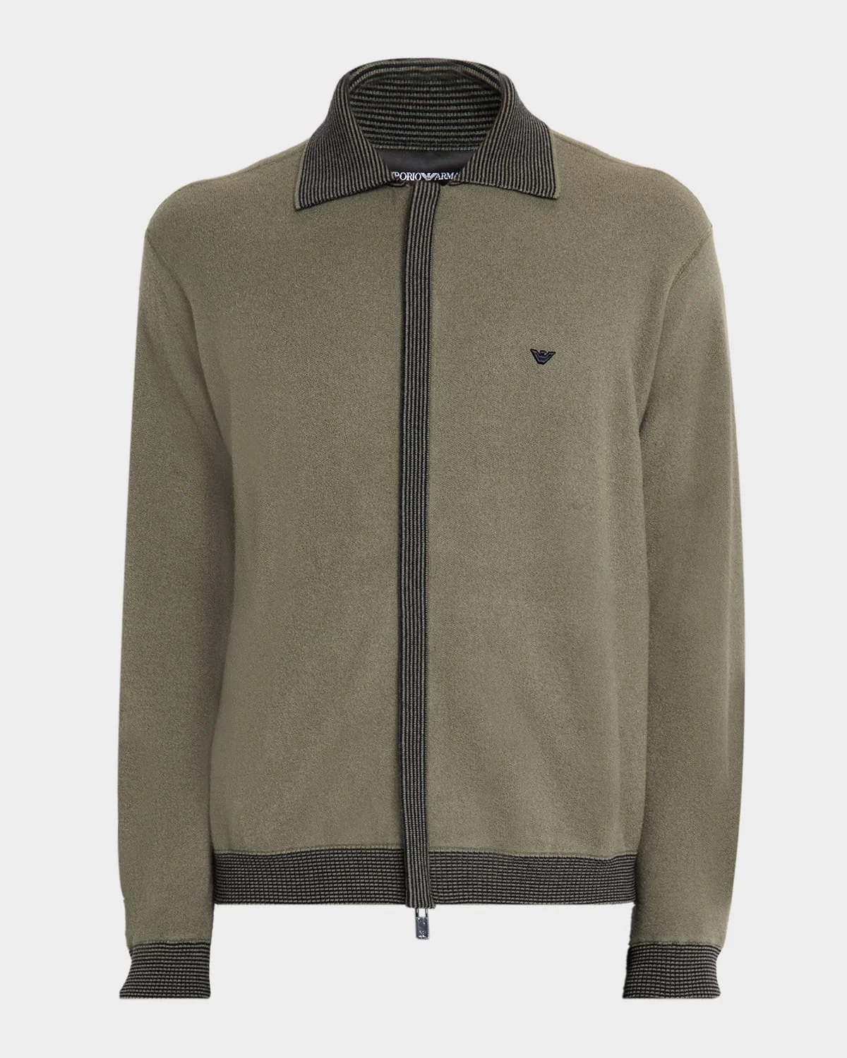 Emporio Armani cardigan is knit in a woolblend featuring striped trim and an embroidered logo on the chest Point collar Long sleeves Regular fit Hip length Concealed twoway zip front closure Virgin wool/nylon/polyamide Dry clean Imported