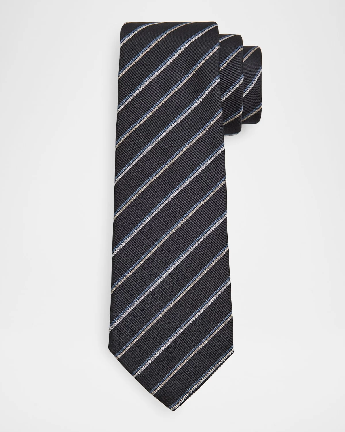 Diagonal doublestripes on luxurious silk create a timeless sophistication to this Emporio Armani tie. Silk Dry clean Made in Italy