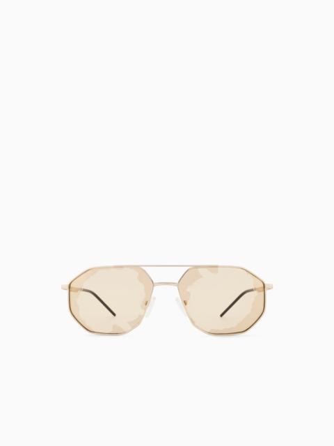 Irregular-shaped men’s sunglasses with metal frame. The double-bridge shape and detail with the iconic Emporio Armani logo on the temple complete the style. Asian fit. Product Code: EA2147LNLP30157FL