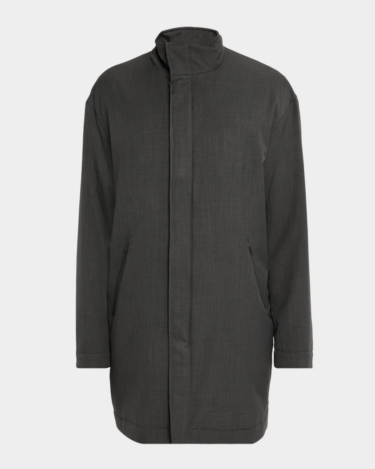 Emporio Armani car coat is crafted of a lightweight, padded technical fabric Stand collar Snapconcealed zip front Long sleeves Angled hip double welt pockets Loose fit Hem falls below the hip Polyester/viscose Fill: Down Dry clean Made in Bulgaria