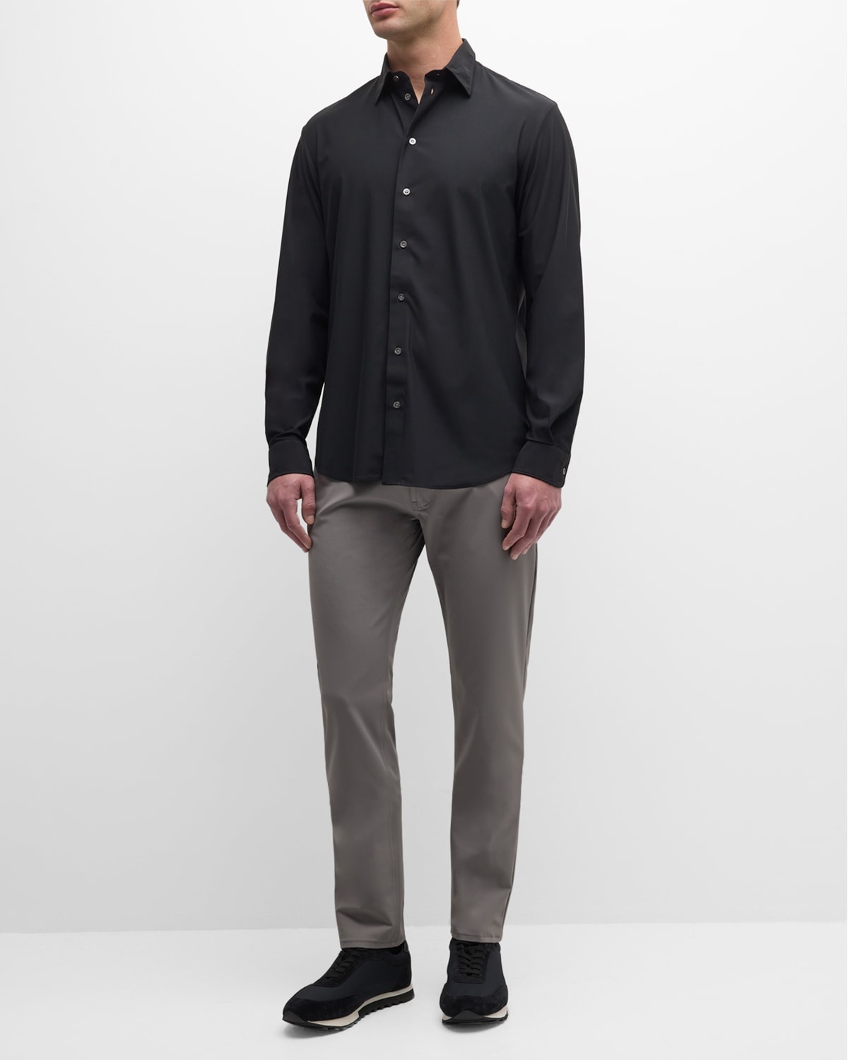 - Emporio Armani solid sport shirt in nylon jersey stretch fabric - Point collar - Button placket - Long sleeves - Curved hem - Nylon/polyamide/elastane - Dry clean - Imported Model is 6'1"/185cm. Online Inquiries: NMS21_NBRXQ Store Inquiries: #4705333
