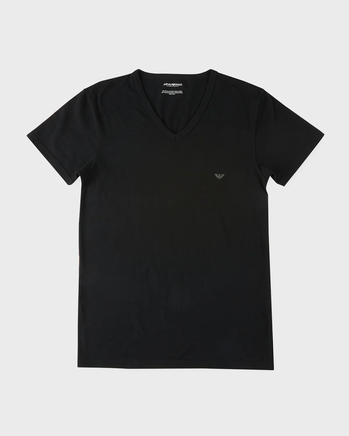 Emporio Armani Tshirt with Vneck detail. V neckline. Short sleeves. Pullover style. Cotton/spandex lining. Machine wash. Made in Vietnam.