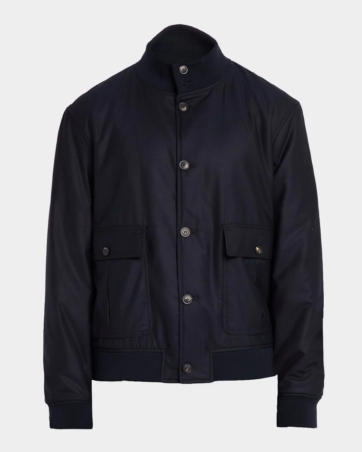 Ribbed trims create a comfortable finish to this bomber jacket from Emporio Armani. Ribbed stand collar Button front Buttoned hip flap pockets Ribbed cuffs and hem Virgin wool/polyester/nylon/polyamide Dry clean Made in Bulgaria