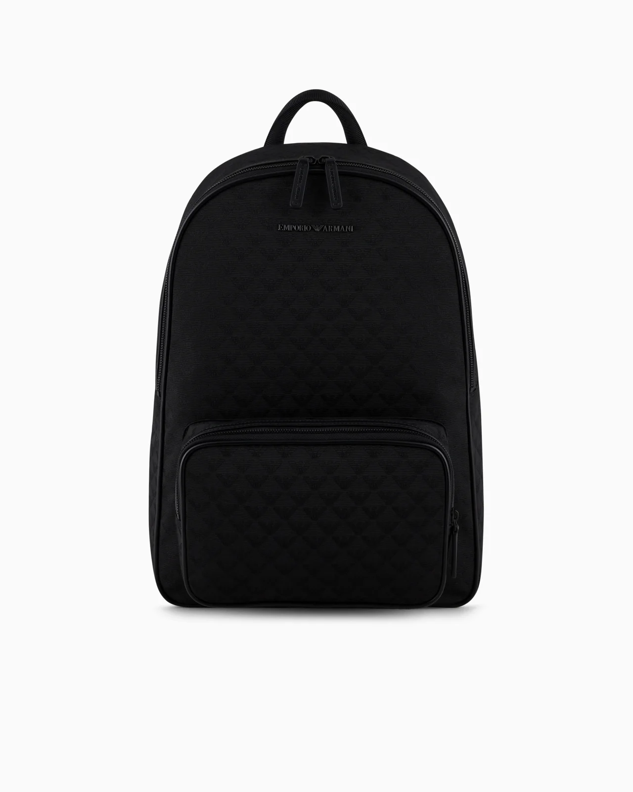 Round backpack with front zip pocket: perfect for both city living and trips away. The exclusive jacquard depicting the all-over iconic eagle creates a distinctive, recognisable texture. A series of accessories that are both classic and modern, enhanced by the front applied Emporio Armani lettering and satin finish. This accessory belongs to the Essentials selection, the Emporio Armani capsule collection that is an evergreen statement of style: an ongoing collection with clean, well-designed shapes for a wardrobe that meets the demands of any season. Product Code: Y4O315Y022V181336 Details Composition 52% Polyester 48% Cotton Measurements: 45 x 32 x 11 cm Jacquard nylon All-over eagle Metal logo Top handle Zip closure Adjustable shoulder straps Breathable mesh back This backpack is suitable for carrying: phone, wallet, card holder, 15-inch laptop, documents