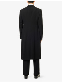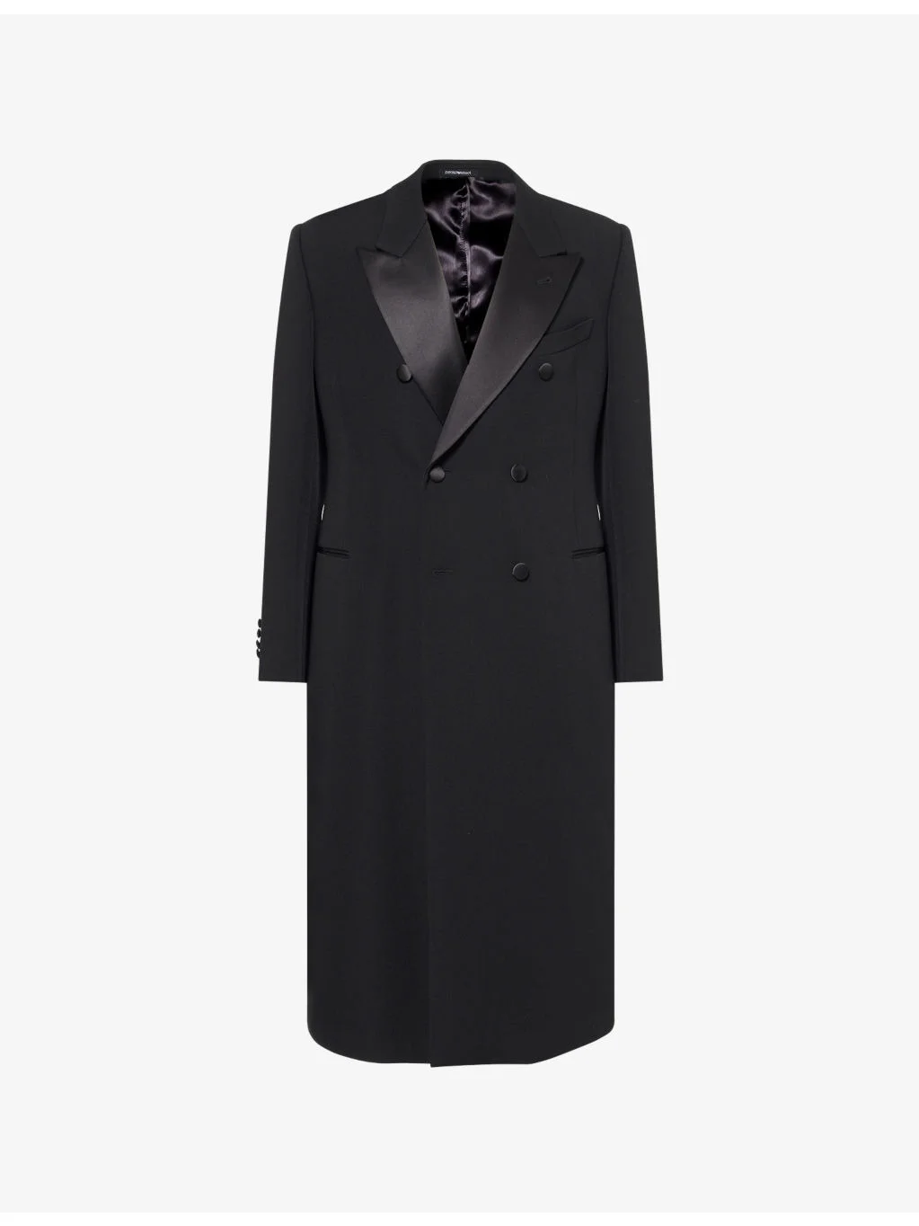 PRODUCT DETAILS - Emporio Armani wool coat - 100% virgin wool; contrast 57% polyester, 43% silk; lining 100% viscose - Exposed button fastening at front - Regular fit, double-breasted, peak lapels, padded shoulders, long sleeves, buttoned cuffs, welt pocket and two jetted pockets at front, textured, satin trims, fully lined, single vent - Dry clean - Made in Italy - Size UK 40: length 47in / 120cm, chest 40in / 102cm - Model is 6ft 2in/1.88m and wears a size UK 40 - Midweight, slight stretch Ref: R04537661
