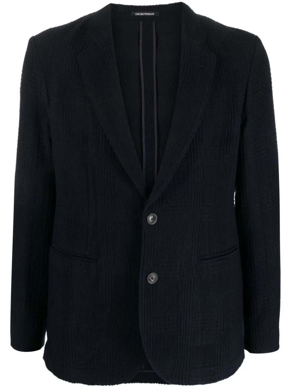 plaid-check texture single-breasted blazer Highlights - Navy blue - Virgin wool blend - Plaid check pattern - Notched collar - Front button fastening - Two front jetted pockets - Long sleeves - Straight hem Imported Composition Outer: Virgin Wool 66%, Polyamide 24%, Viscose 10% Lining: Acetate 68%, Polyester 32% SIZE & FIT Model measurements Height 6 ft 1 in(1.85 m) Bust/Chest 38.58 in(98 cm) Hips 37 in(94 cm) Waist 30.31 in(77 cm) FittingInformation Designed for a slim fit, offering a comfortable fit that sits just away from the body Made from a midweight non-stretch fabric This piece fits true to size – take your usual size Washing instructions Dry Clean Only
