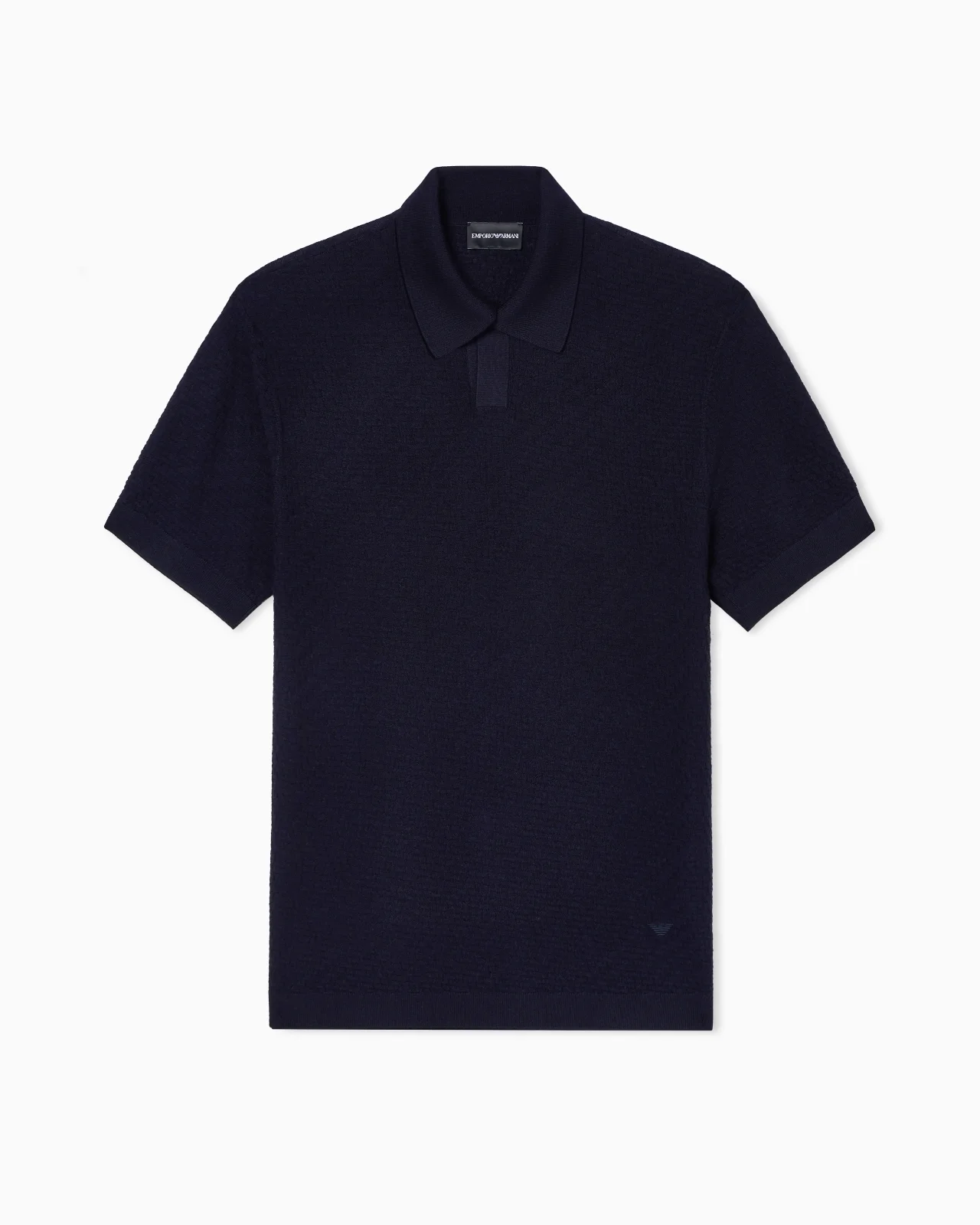Short-sleeved jumper with a polo-shirt collar, made of virgin wool and featuring a plain-and-purl knit with an all-over raised check motif. Fineness: 16 Plain knit Check motif Polo-shirt collar Short sleeves Micro eagle embroidered on the left hem Product Code: EM004312AF23757UB109