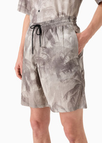 Drawstring Bermuda shorts with an elasticated waist. They are made from a blend of cotton and Lyocell, a semi-synthetic fibre known for its extremely low impact on the environment. Produced from eucalyptus trees, Lyocell is valued for its high durability and excellent breathability and absorbency. Silky fabric with all-over palm tree print. Product Code: 3D1PE31NRDZ1F617 Details Composition 56% Lyocell 44% Cotton Silky fabric All-over print Elasticated drawstring waist Concealed zip closure Side inseam pockets Back welt pockets Fitting The model is 188 cm tall and is wearing size 48/M (Italian Size)