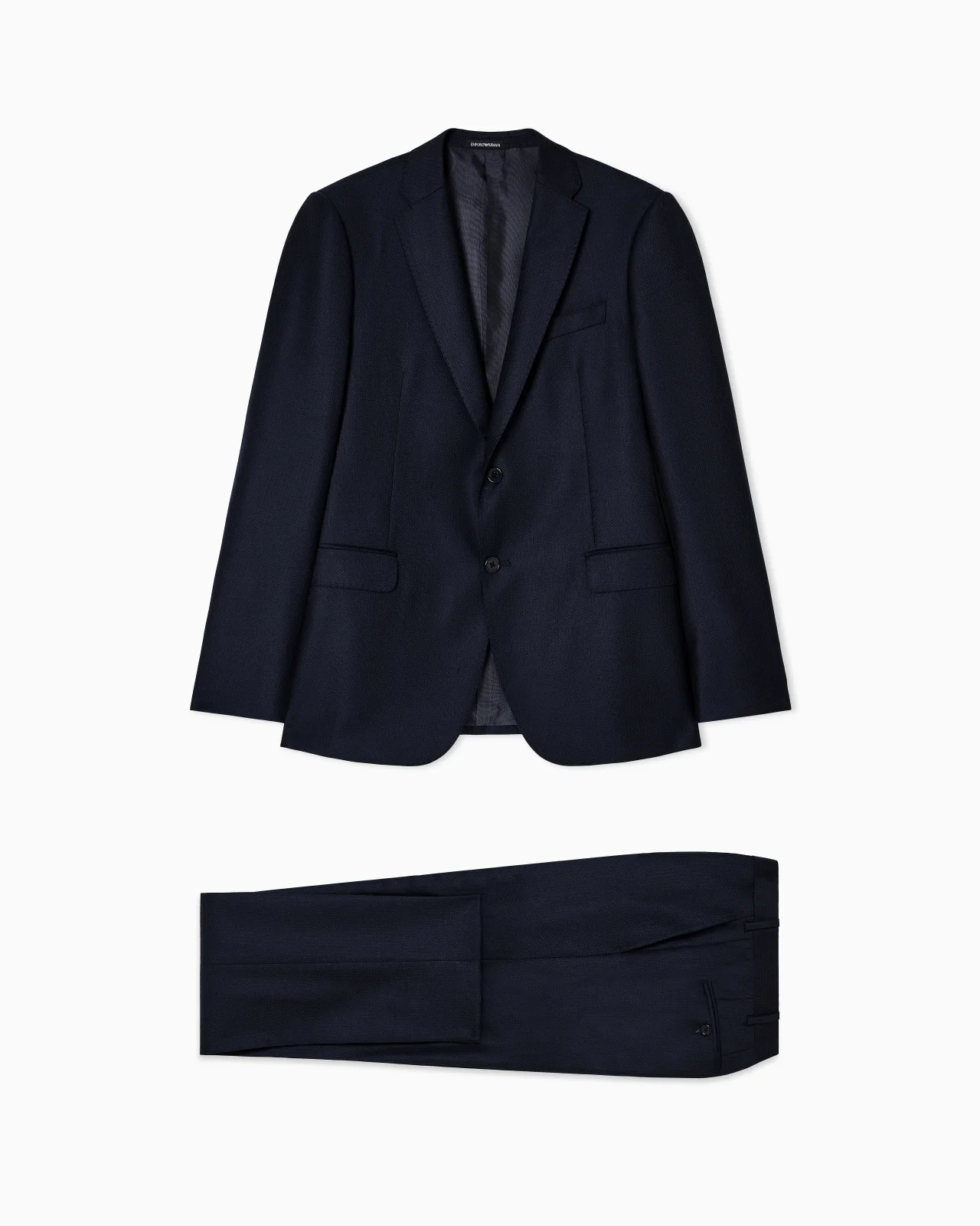 Regular-fit suit consisting of a single-breasted jacket with notched lapels and sleeve-head rolls that make the silhouette more modern and defined, and matching classic-fit trousers. The piece features a texture with a micro-chevron motif dotted with all-over micro polka dots: the general effect is that of a dense pale dot distributed regularly on a darker background. The formal design of the suit combines with a sophisticated fabric suitable for formal occasions while maintaining a classic yet modern look. Regular fit Drop: 7 Two-piece suit Single-breasted jacket Jacket length: 73 cm Notched lapels Two-button closure Long sleeves Pocket-square pocket Side welt pockets with flap Two back vents Lined garment Trousers without pleats Waist with belt loops Zip and button closure Ankle cuffs: 19 cm Product Code: EM000098TE16859FB199