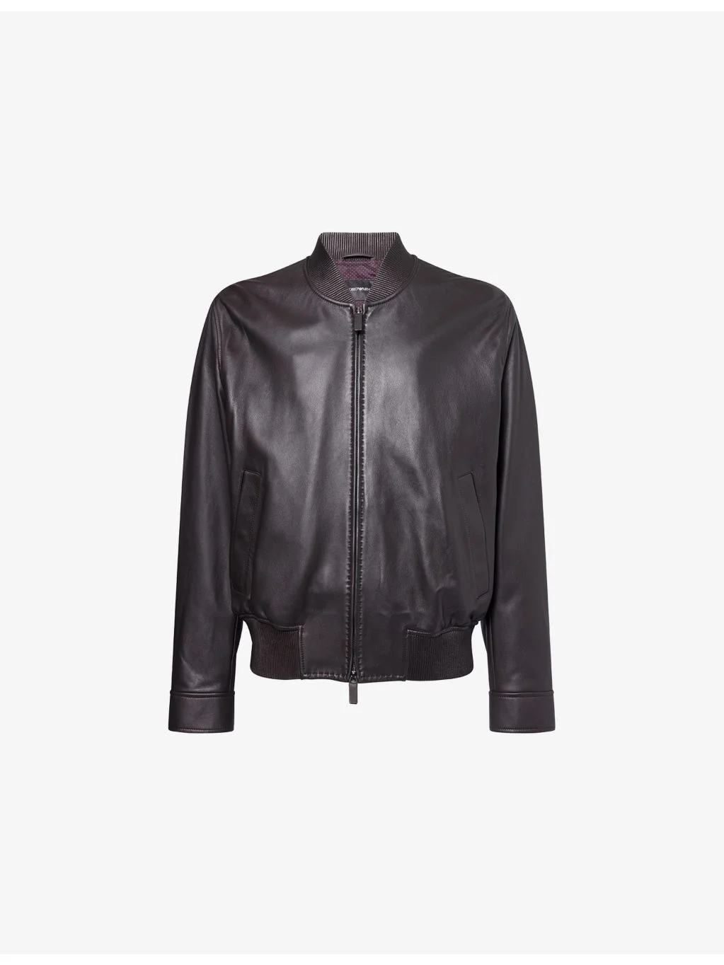 PRODUCT DETAILS - Emporio Armani leather jacket - 100% leather - Exposed zip fastening at front - Relaxed fit, long sleeves with press stud fastening at cuff, slanted slip pockets with press stud fastening at front, all-over leather texture, ribbed trims, fully lined - Specialist leather clean - Made in India - Size UK 40: length 27.5in / 70cm, chest 43.3in / 110cm - Model is 6ft 2in/1.88m and wears a size UK 40 - Midweight, non-stretch Ref: R04482691