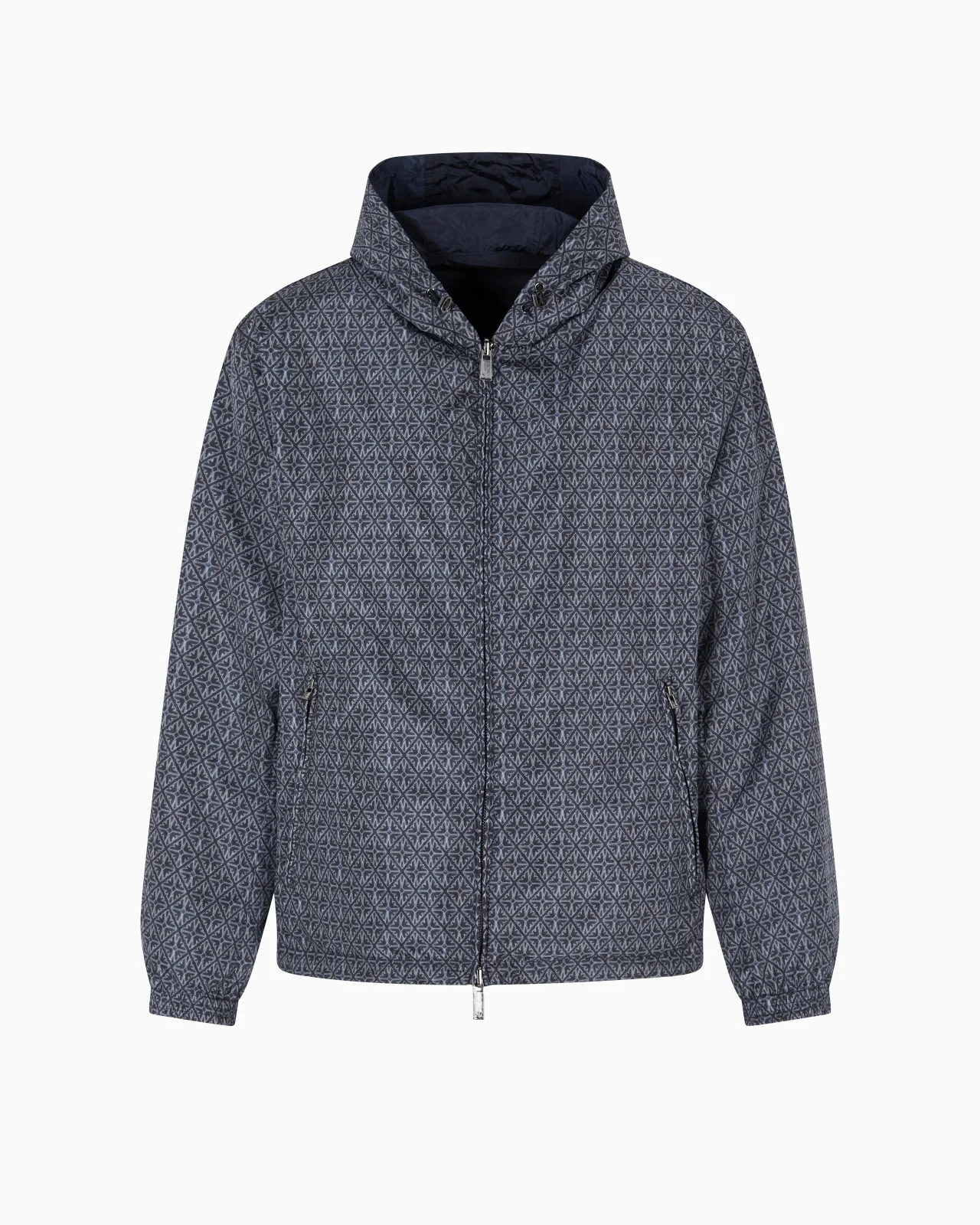 Blouson with hood and front zip, a versatile garment thanks to its reversible design. Made of nylon, it features an exterior printed with a unique, dense eagle motif, strategically placed to create the typical majolica pattern all over; while the solid-coloured inner side is elevated by a tumbled patch with embossed logo. Reversible Nylon Printed exterior Solid-coloured interior with logo patch Hood Zip closure Long sleeves Stretch cuffs Outer side pockets with zip Interior side pockets with press studs Drawstring hem with side pulls Product Code: EM003265AF12021FB286