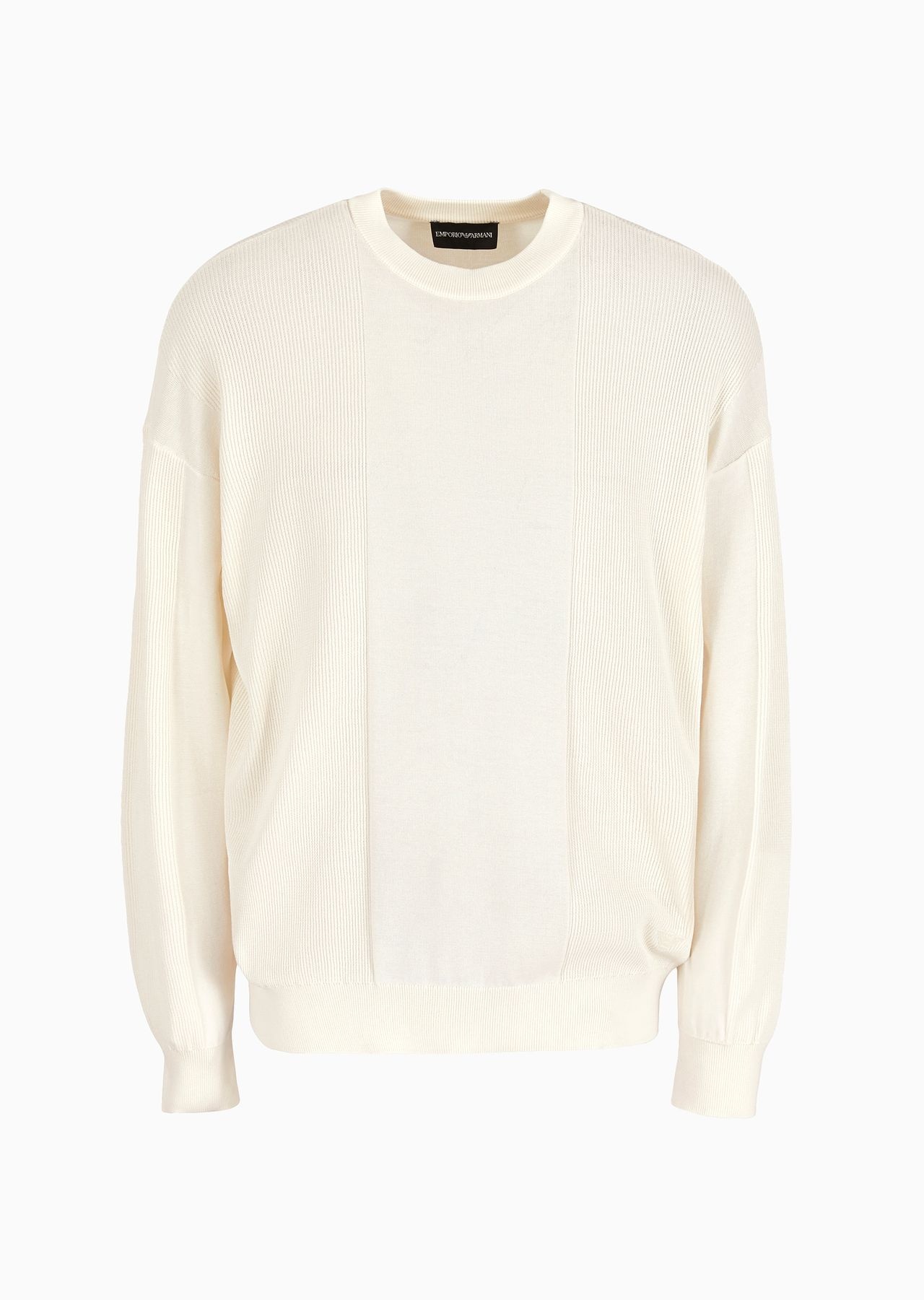 Crew-neck jumper featuring a ribbed weave with reverse plain-knit inserts on the front, back and sleeves. Product Code: 3D1MXH1MPIZ10128 Details Composition 100% Cotton Fineness: 14 Ribbed knit Reverse plain-knit inserts Crew neck Long sleeves Rib-knit cuffs and hem Micro eagle embroidered on the left hem Fitting The model is 188 cm tall and is wearing size 48/M (Italian Size)