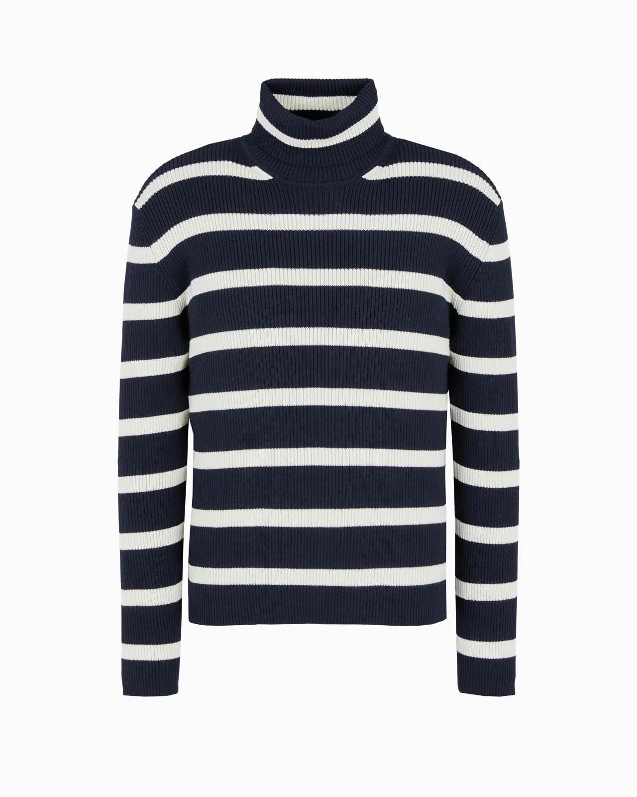Rollneck jumper made from a ribbed wool and cotton blend. The jacquard pattern of contrasting horizontal stripes instantly brings to mind the typical sailor-inspired motif. Product Code: 6D1MVC1M13Z10922 Details Composition 53% Virgin Wool 47% Cotton Fineness: 12 Rib knit Striped design Rollneck Long sleeves Ribbed trim Fitting The model is 188 cm tall and is wearing size 48/M (Italian Size)