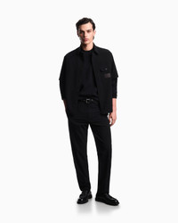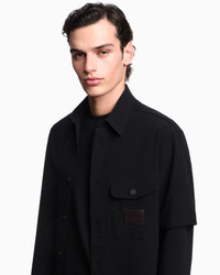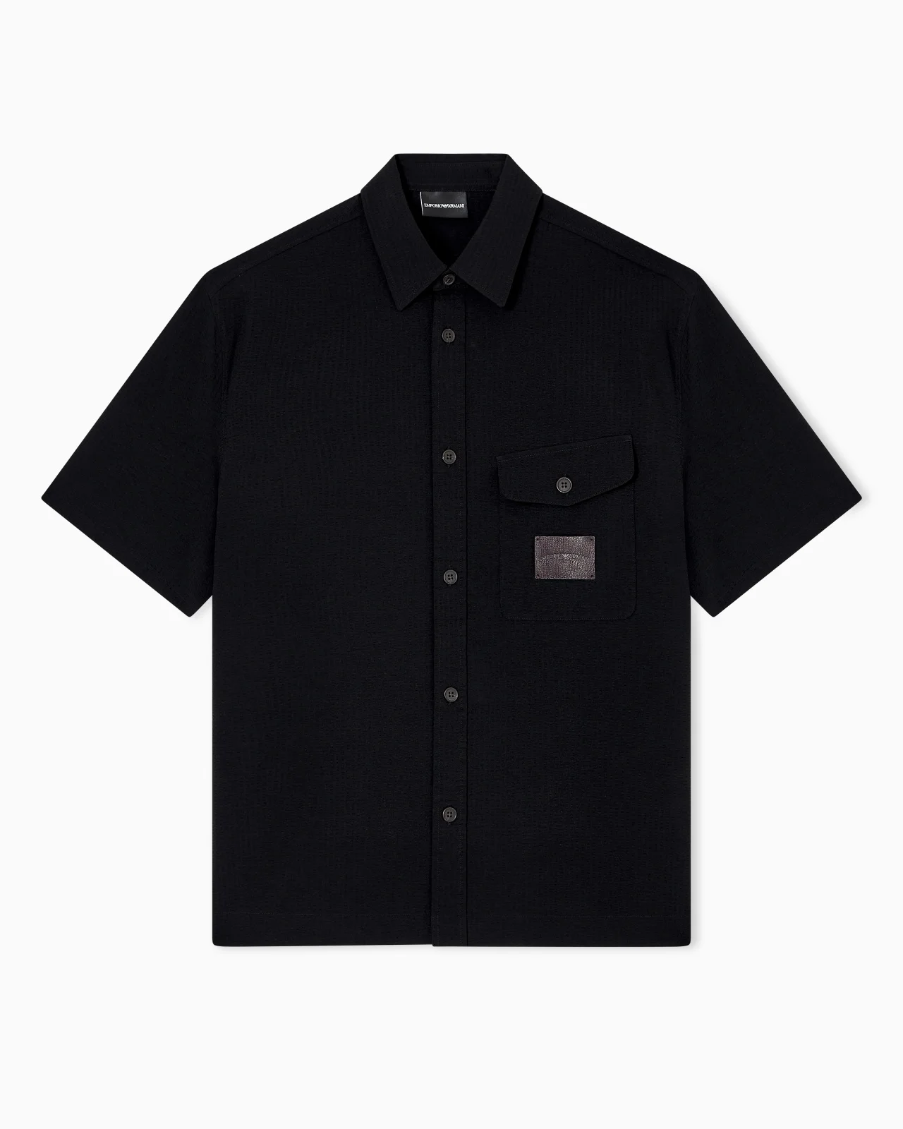 Oversized short-sleeved shirt with front patch pocket with logo patch. The item is made of a nylon spandex with a light, textured appearance, in a modern design that blends with the exclusive seersucker fabric, one of the textures favoured by Armani and that gives the entire piece a dynamic, crisp feel. Oversized fit Nylon Seersucker Classic collar Front buttoning Short sleeves Patch pocket with flap Logo patch Product Code: EM003410AF18781UC001