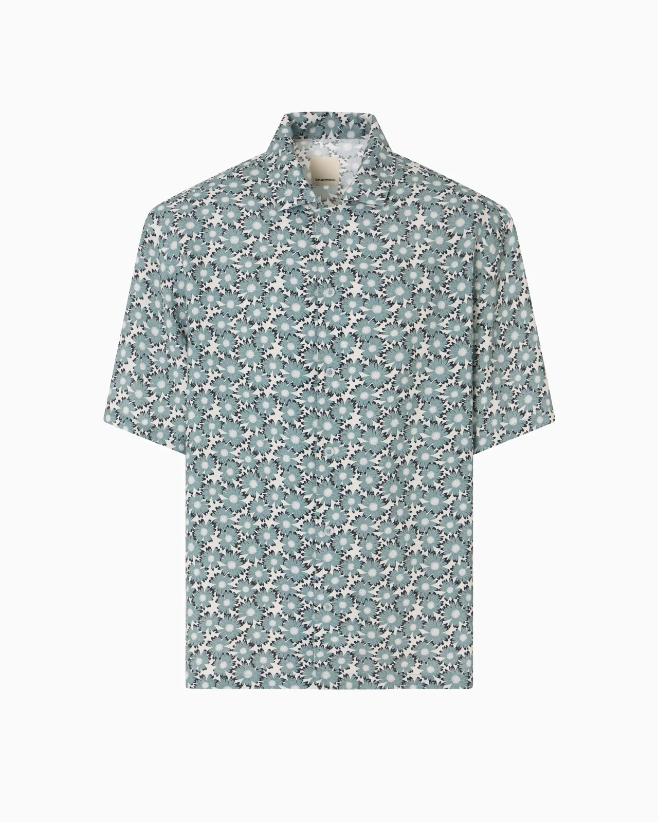 Short-sleeved shirt with an oversized fit, made from a linen and viscose blend. The original collection print runs across the entire item, completing it with distinction. This season’s Armani Sustainable Values (ASV) capsule collection draws inspiration from the feeling and profound, universal meaning of PEACE. The keyword that connects the entire collection is expressed in all its forms, enhancing simplicity, harmony and the eternal link between mankind and nature, offering a wardrobe composed of practical, comfortable and highly versatile daywear pieces designed to accompany us seamlessly throughout the day. Smooth, sometimes shiny surfaces merge with floral jacquard motifs and all-over prints depicting the symbol of peace. Oversized fit All-over print Classic collar Front buttoning Short sleeves Logo patch Product Code: EM001084AF13858FB065