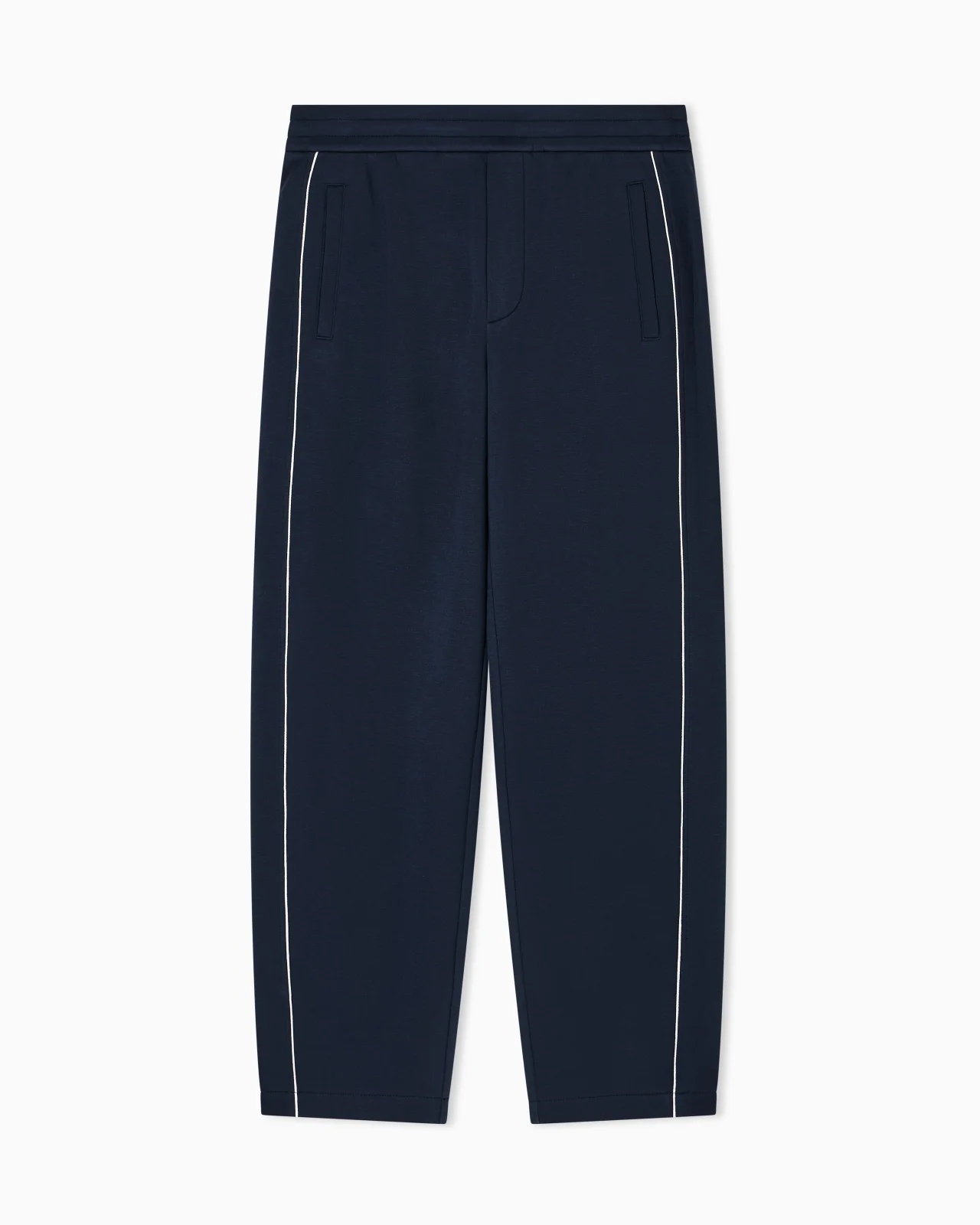 Elasticated-waist trousers with internal drawstring, featuring decorative piping on the sides and made of cosy 100% modal double jersey. The metal EA logo plate on the back completes the piece with understated elegance. Double jersey Elasticated waist Inner drawstring Concealed zip fly Side welt pockets Decorative piping Back welt pockets EA logo plate Product Code: EM002886AF17545UB118