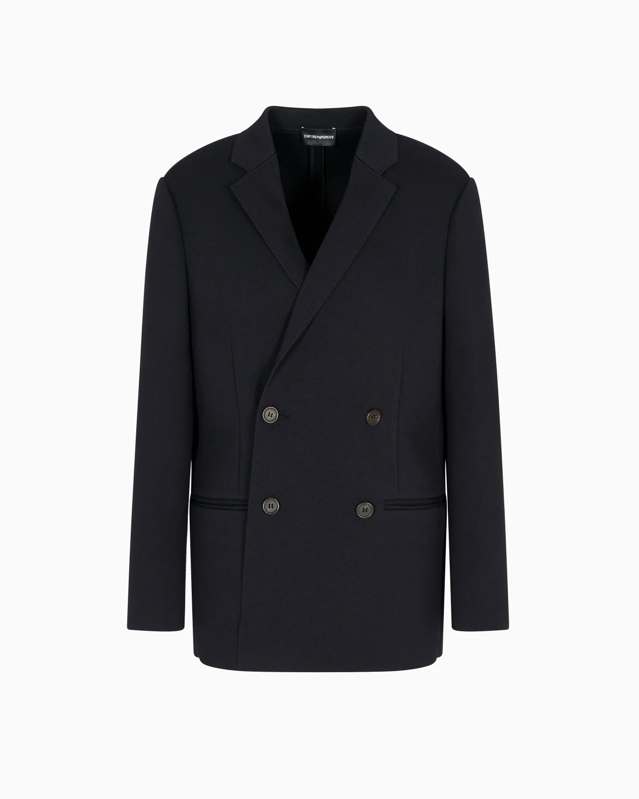 Double-breasted blazer in a compact plain knit. A piece with a comfortable allure that does not lose sight of Emporio Armani’s statement: modern, sophisticated, versatile. Fineness: 16 Compact plain knit Double-breasted Lapel collar Long sleeves Double-welt side pockets Product Code: EM002428AF19441UB118